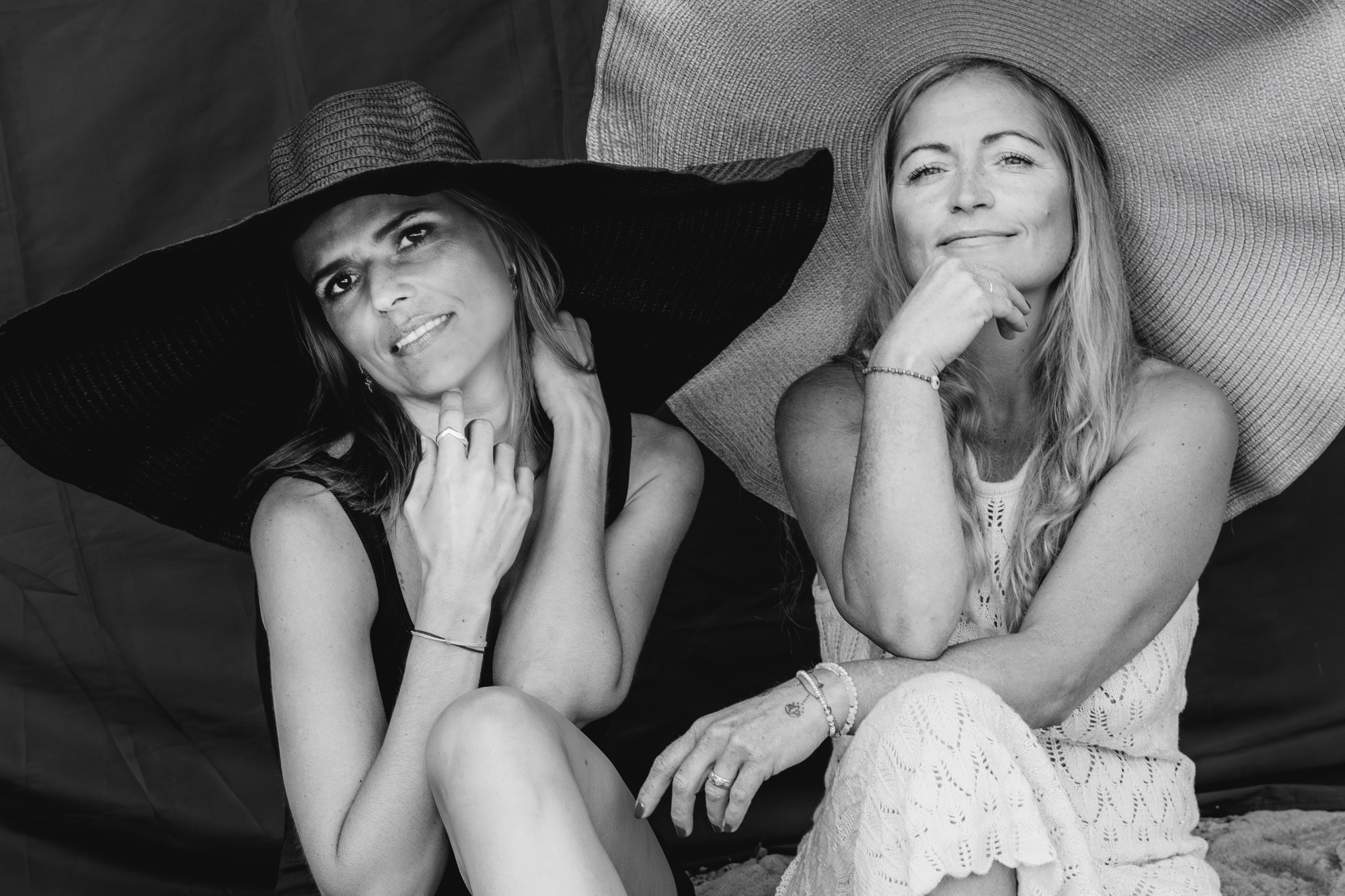 - Zwei Frauen in Schwarz-Weiß, eine mit großem Hut