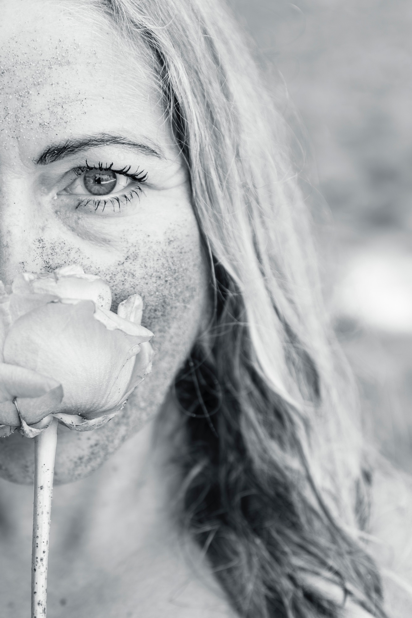 - Frau mit langen Haaren hält eine Rose vor ihrem Gesicht
