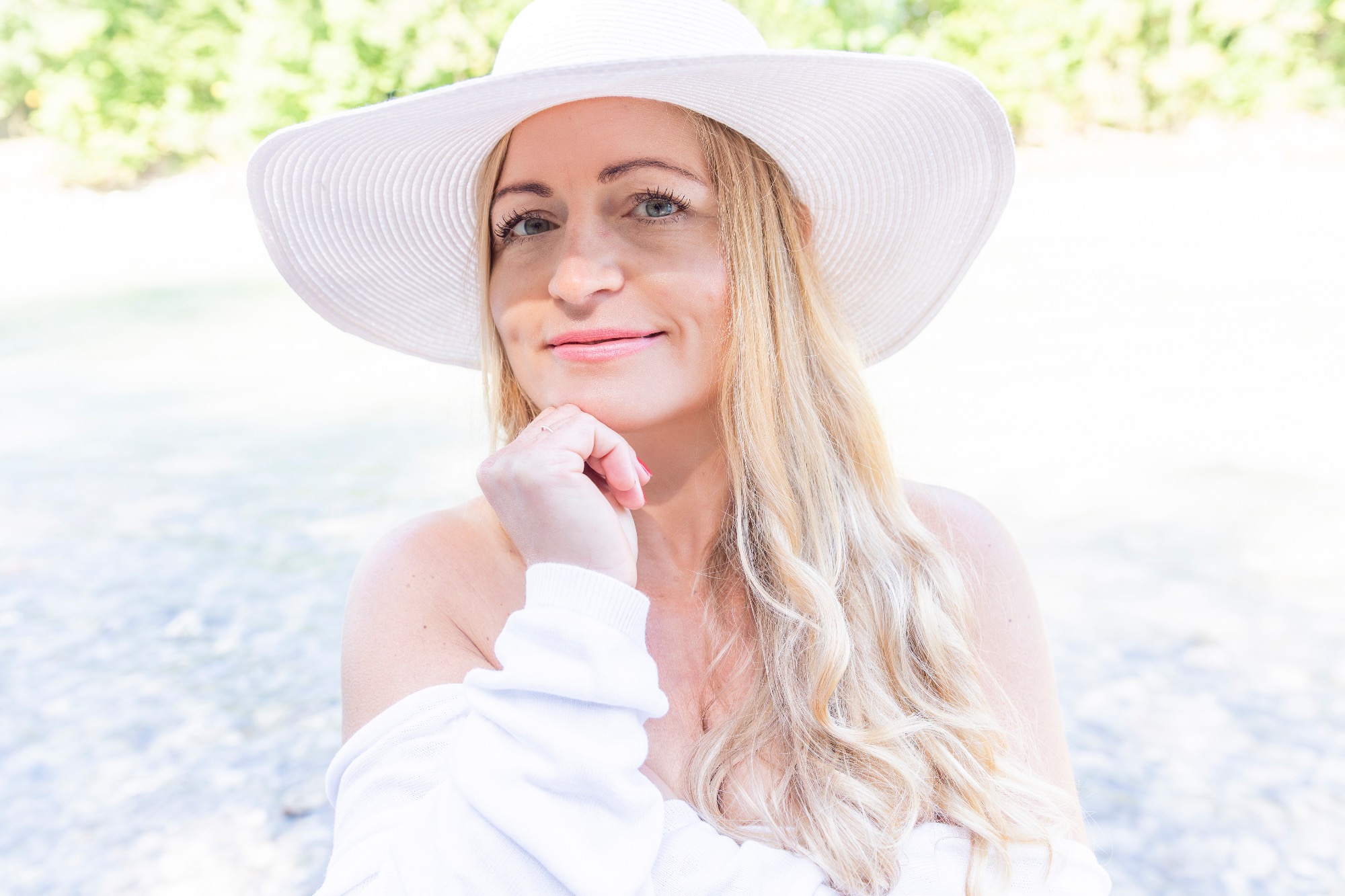 - Blonde Frau mit Hut lächelt