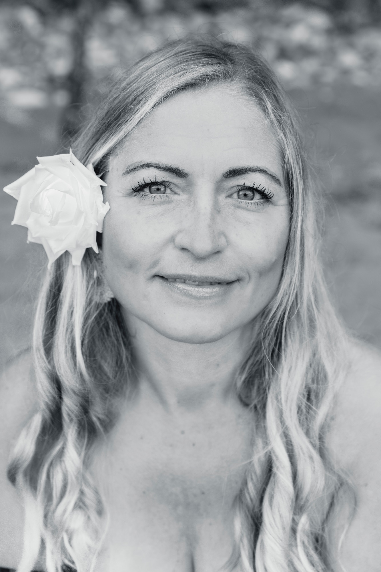 - Frau mit blonden Haaren und einer weißen Blume im Haar